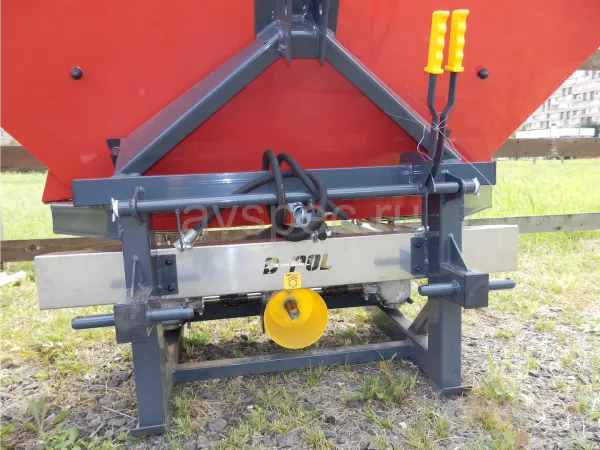 Перевод закрытых в режиме транспортировки заслонок разбрасывателя D-POL РУМ 1000 в рабочее положение производится при помощи гидроцилиндра, соединенного шлангом с гидравликой трактора. Это позволяет трактористу в любой нужный момент включать и выключать режим рассеивания минеральных удобрений, не покидая кабины.