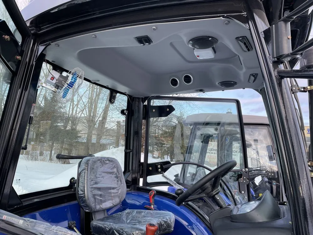 Установленная на тракторе кабина соответствует требованиям сертификации OECD и отличается современным европейским дизайном. Панорамное остекление обеспечивает водителю удобный обзор, а наличие отопителя ‒ комфортные условия работы в холодную погоду.